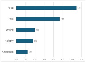 The same analysis was conducted for full-service restaurants. As shown in Table 5, the five factors account for 37.3% of the variance. The first factor, which explains 12.1%, is very similar to the fast-food first factor; both are named Food. In full service, however, friendly wait staff and appealing taste have been added. The second factor, online, also includes gluten-free and organic options, delivery services, late hours, and child-friendly features, and accounts for 8.0%. Ambiance includes cleanliness as well as décor and explains 7.6%. Deals include coupons, special offers, and loyalty rewards, and explains 5.2%. Reservations are associated with trustworthiness and are relatively unimportant.